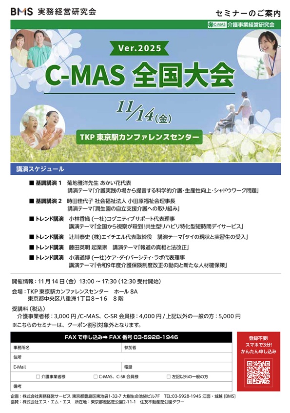 - 介護事業経営支援の専門家ネットワークC-MAS介護事業経営研究会の今年の全国大会は、11月14日(金)13:00〜17:30(12:30受付開始)、TKP東京駅カンファレンスセンターのホール8A(東京都中央区八重洲1丁目8−16 8階)で開催されます。